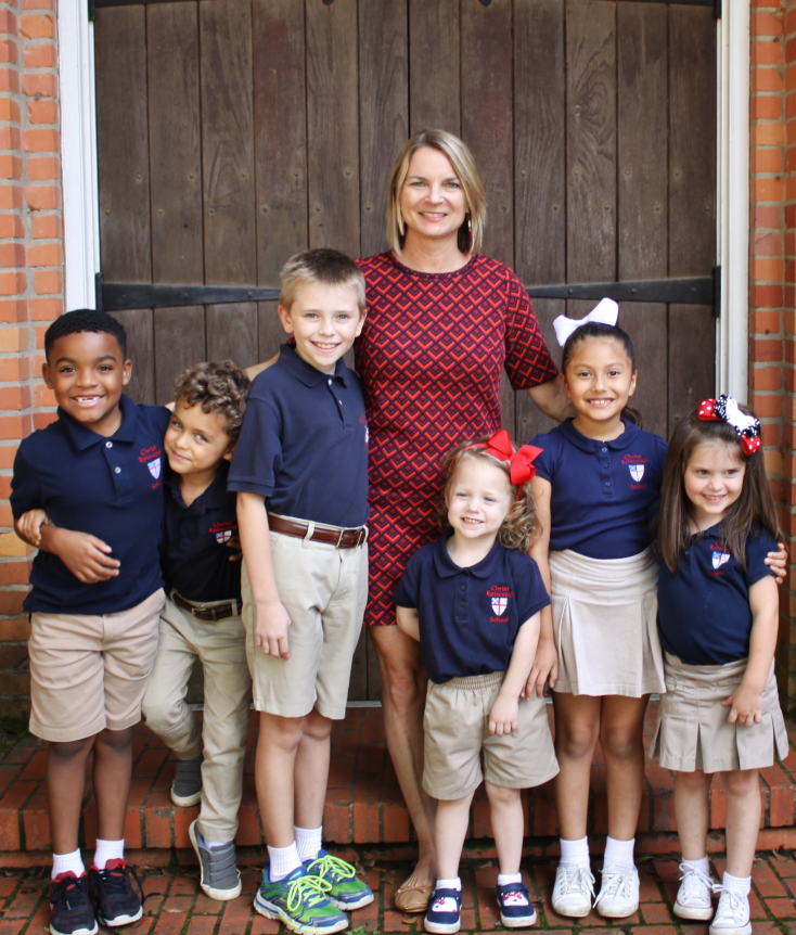 Photo: Head of School Catherine Oliver stands with a group of eager students at Christ Episcopal School, the Medium Business of the Year in 2025, a Gary Justice Business Excellence Award.